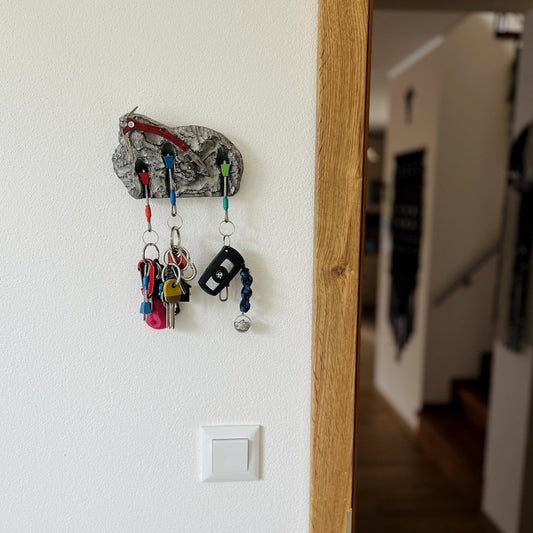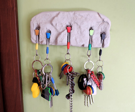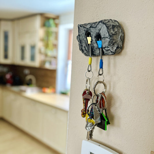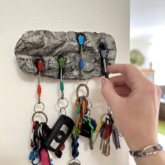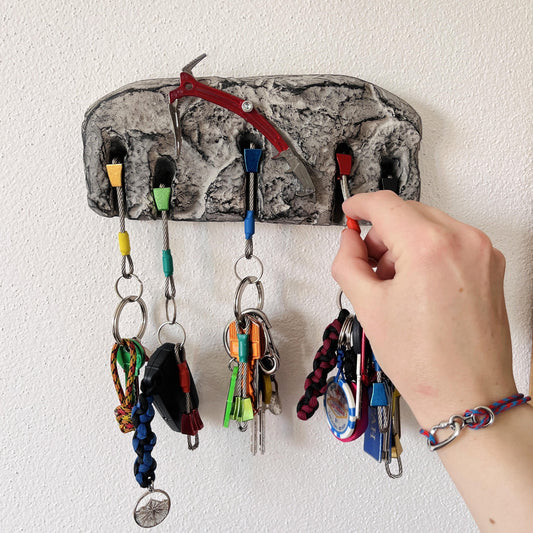 Unique keyholders for climbing & mountaineering lovers. Real climbing rock appearance. Made of hand-casted and uniquely hand-painted concrete rocks + steel climbing nut keychains.