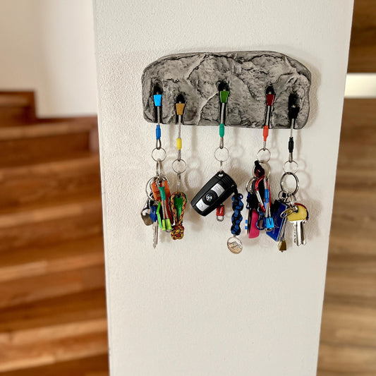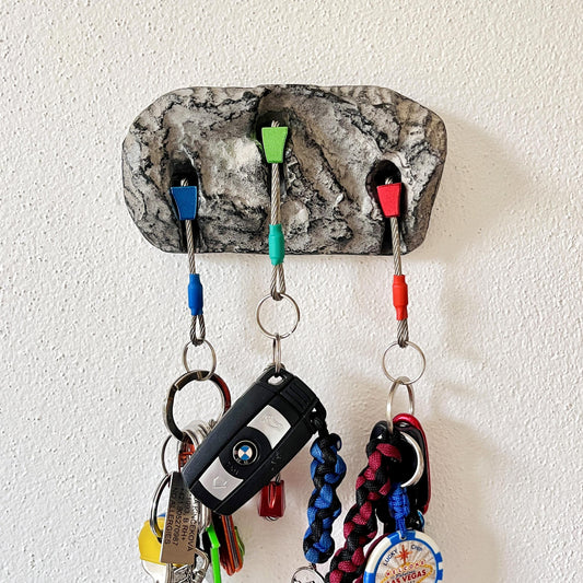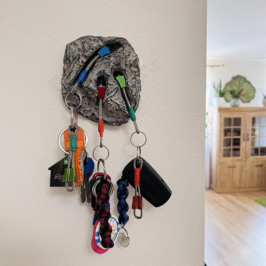 Unique keyholders for climbing & mountaineering lovers. Real climbing rock appearance. Made of hand-casted and uniquely hand-painted concrete rocks + steel climbing nut keychains.